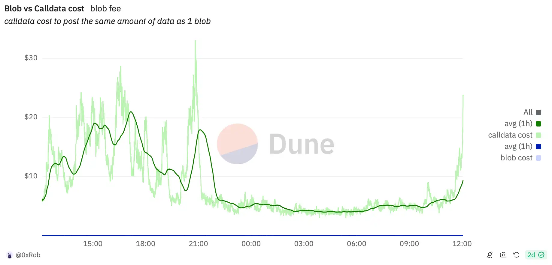 以太坊 Call Data 成本及 EIP-4844 后 blob 成本对比,数据来源:Dune