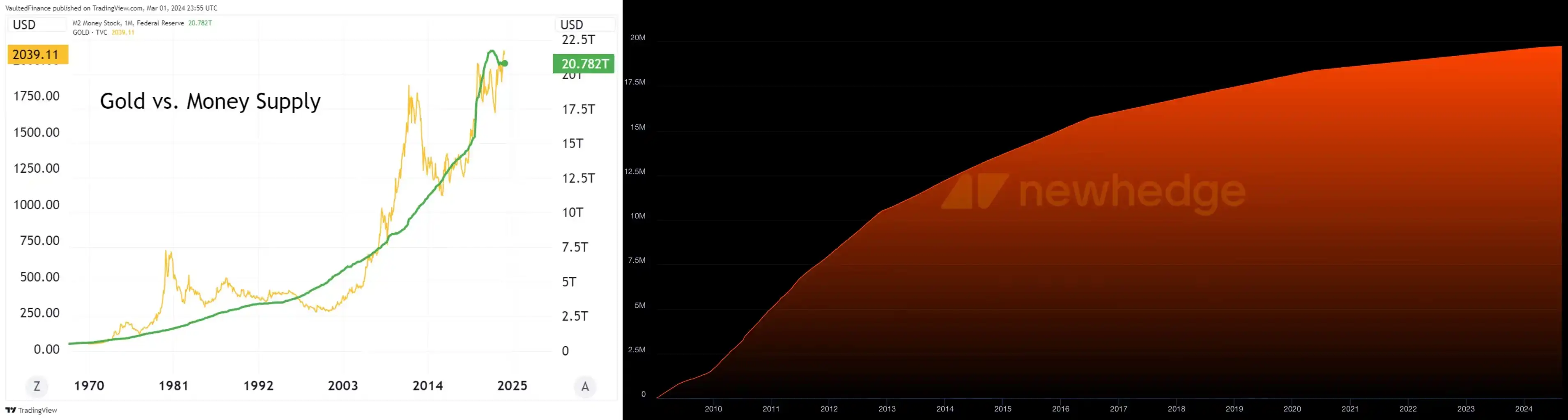 左:黄金对 M2 供给量增长趋势,图源来自 Vaulted;右:BTC 供给增长趋势,图源来自 newhedge