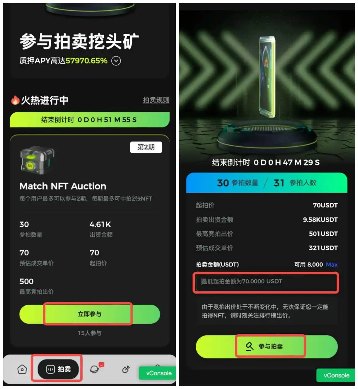 2. 前置准备完成后进入「拍卖」页面,点击「立即参与」按钮,输入出价金额,进行竞拍。