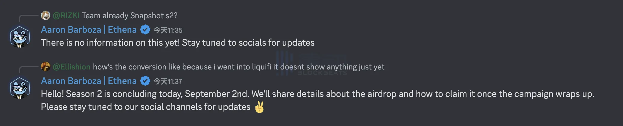 消息,9 月 2 日,Ethena 团队成员在其官方 Discord 频道表示,第二季空投活动将于今日结束,团队将在完成总结后,尽快公布空投申领细节。