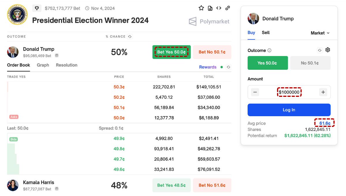 Polymarket 的问题是:价格受到的影响相对于共识的小偏差而言太大了。在下面的市场中,我认为特朗普获胜的几率为 50%,罗伯特·肯尼迪的支持会使他的获胜几率上升到为 55%。问题是,我无法实际进行 100 万美元的交易来赚取 10 万美元(假设我对 50% 到 55% 的预测是正确的),因为购买 100 万美元的押注会使其平均价格暴涨 62%,如果市场的概率重新调整到 55%,我实际上会亏损。