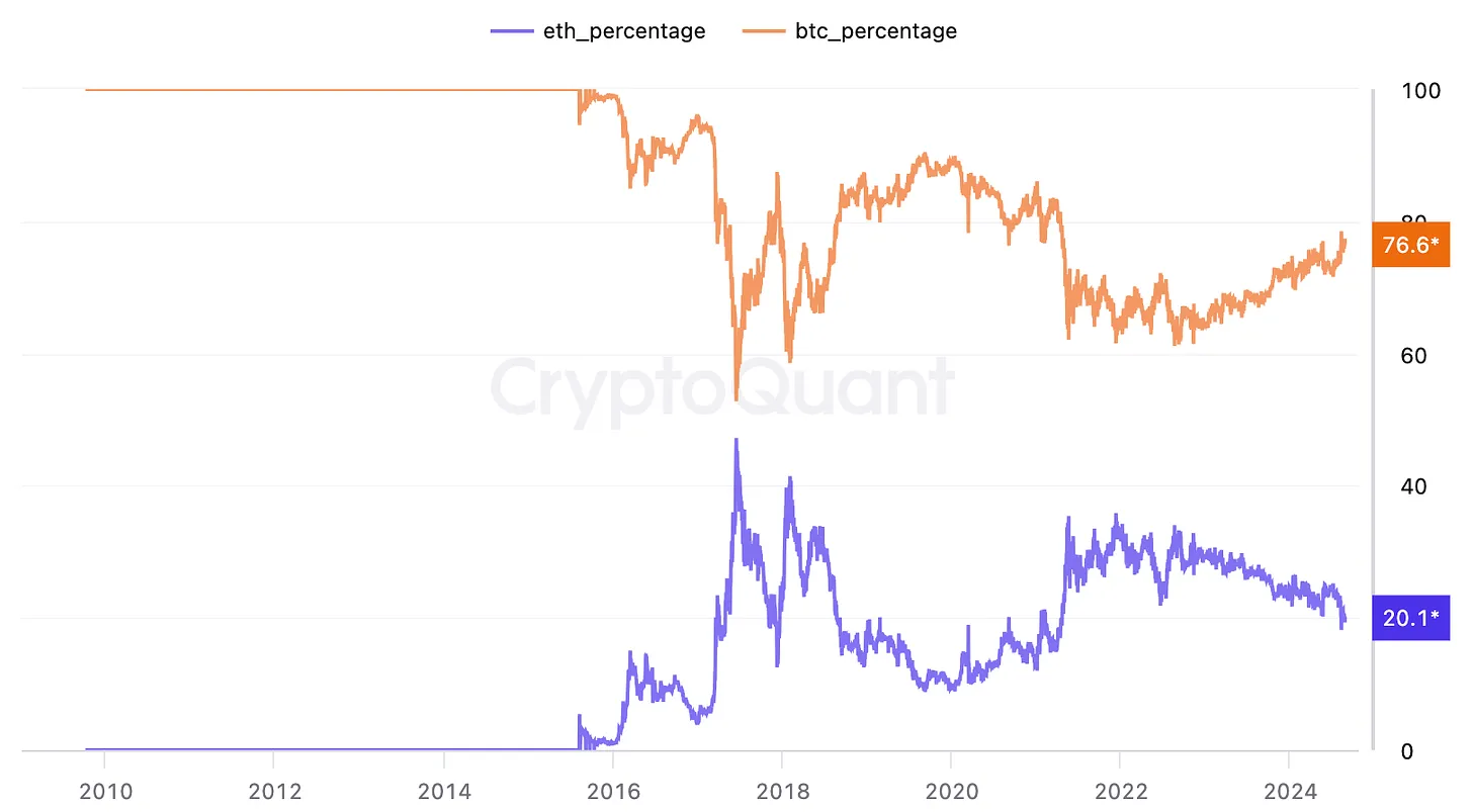比特币的市值主导地位相对于以太坊(ETH)飙升,达到40个月来新高,占比78.5%,并继续占据整个加密生态系统市值的一半以上。这一变化突显了投资者对比特币的偏好更强,而以太坊尚未获得同样的关注。