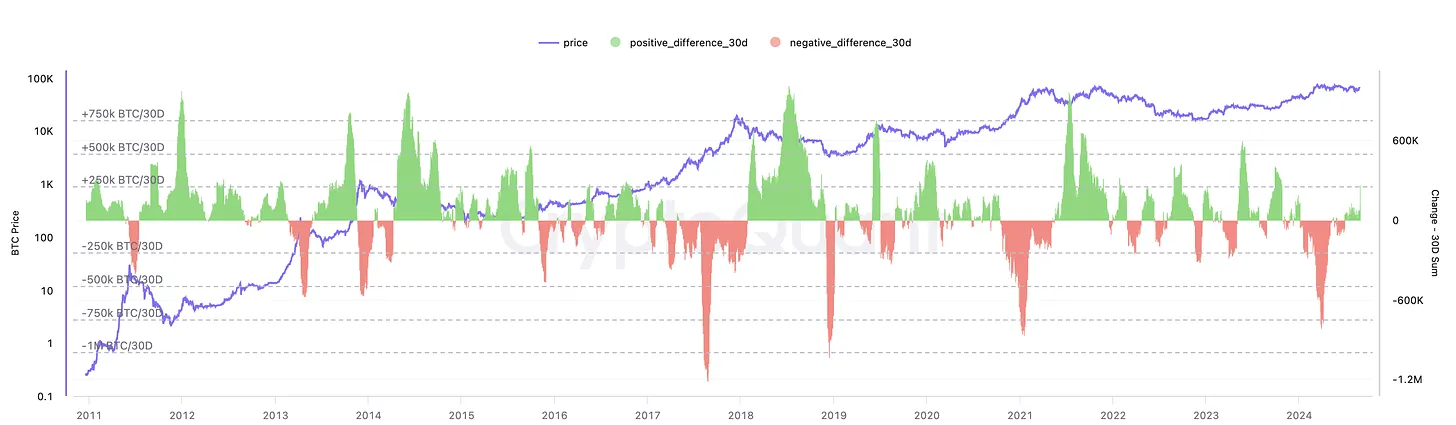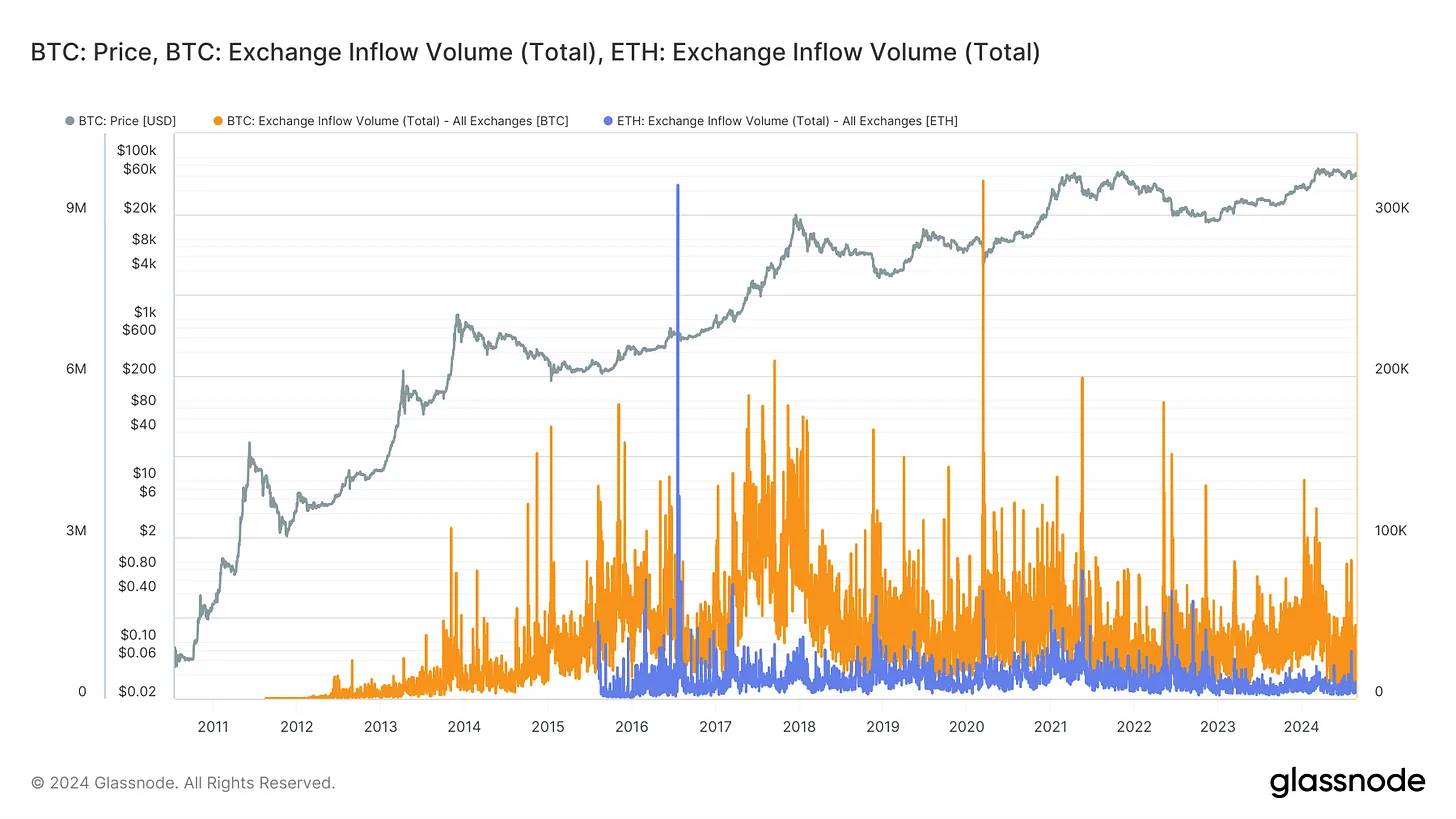 分析 BTC 时,流入量在关键市场事件期间尤为明显,例如2017年牛市和2020-2021年市场激增。这些活动高峰突显了比特币在市场资本化和流动性方面的卓越表现,使其成为市场运动加剧期间的首选资产。比特币的流入规模和频率反映了其在加密货币生态系统中作为主要价值存储的角色,尤其是在投机交易和市场狂热期间。
