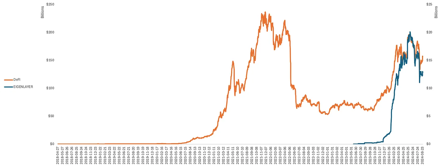 图表显示了DeFi和EigenLayer协议中TVL的演变