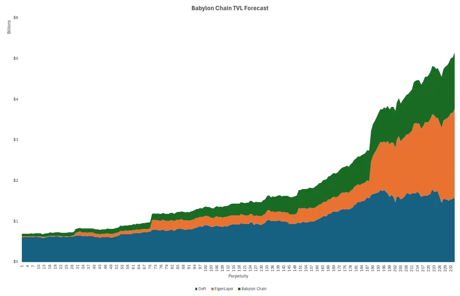 图表展示了 DeFi、EigenLayer 和 Babylon Chain 的预计总锁定价值(TVL),以数十亿美元计,各层的 TVL 值通过层间差异计算得出。DeFi 以蓝色层表示,显示出稳定的增长,达到约10亿美元,而 EigenLayer 以橙色表示,显著增加了总量,贡献约20亿美元。Babylon Chain 以绿色层表示,在后期阶段表现出快速增长,最终将总 TVL 推高至超过60亿美元。