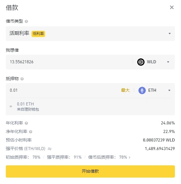 用于申购保本赚币活期产品的数字资产质押到币安活期借币后,仍将继续获得保本赚币活期产品的实时年化收益和阶梯年化收益,但 BNB 无法再享受 Launchpool 收益。如下图所示,WLD 的原始借贷利率为 24.06% ,扣除 ETH 的活期收益后,按照 78% 质押率进行借款,净借款利率为 22.9% 。