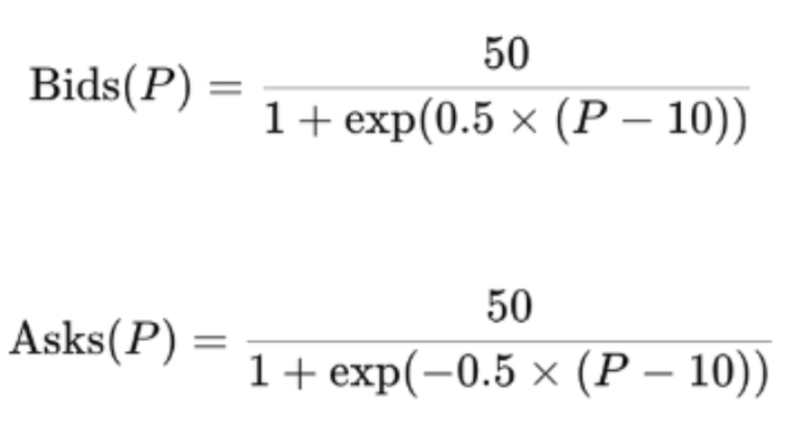 在这里,PPP 代表价格水平。出价函数随着价格的上升逐渐下降,而要价函数则上升,形成了两条曲线相交的自然均衡点。这个相交点代表了交易发生的价格。S 形函数用于模拟当价格偏离中心值时订单数量的逐步变化。