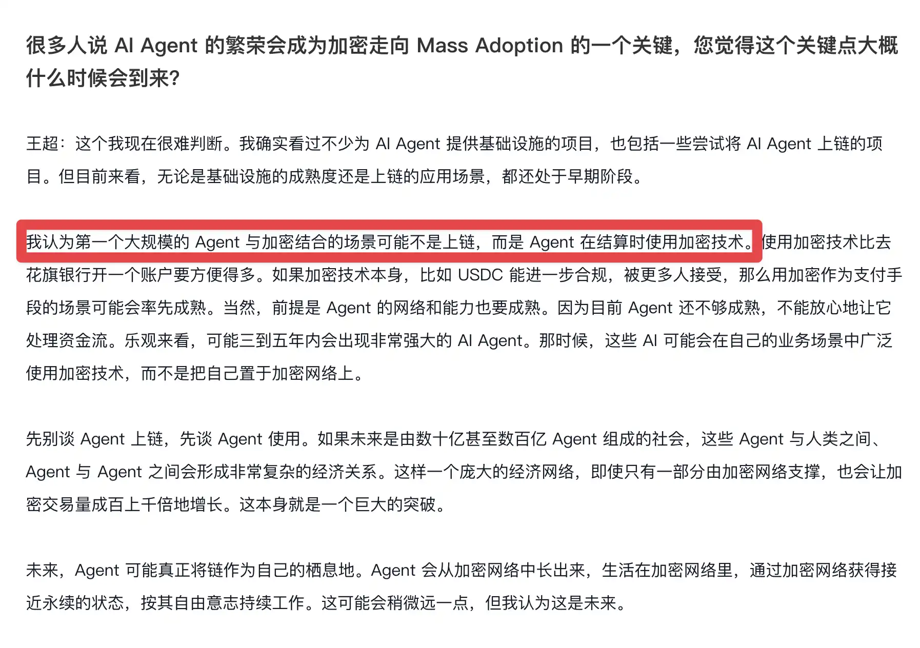 为什么 Coinbase 这么热衷于要给 AI Agent 添加支付功能?正如 DAO 圈 OG、AI 投资人王超在 的专访中所说,第一个大规模的 AI Agent 与加密结合的场景,最有可能是 AI Agent 在结算时使用加密技术。未来的 Agent 经济将会形成一个庞大的新兴市场,为 Agent 提供支付手段的区块链网络也将受益于其上的巨量资金流动。
