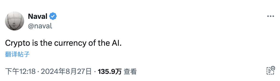 硅谷著名投资人 Naval 前几天发布了一条阅读量超百万的帖子,称:「加密是 AI 的货币。」