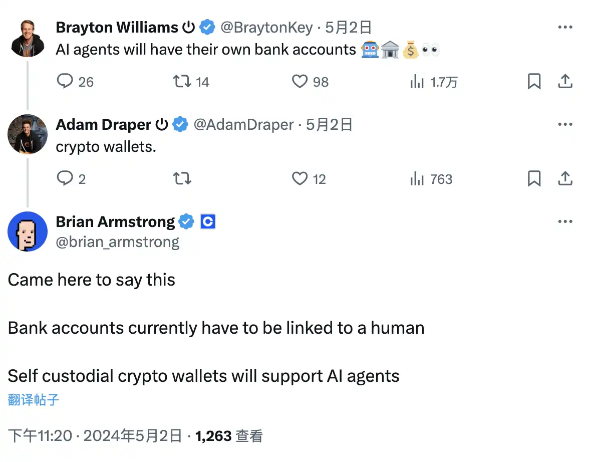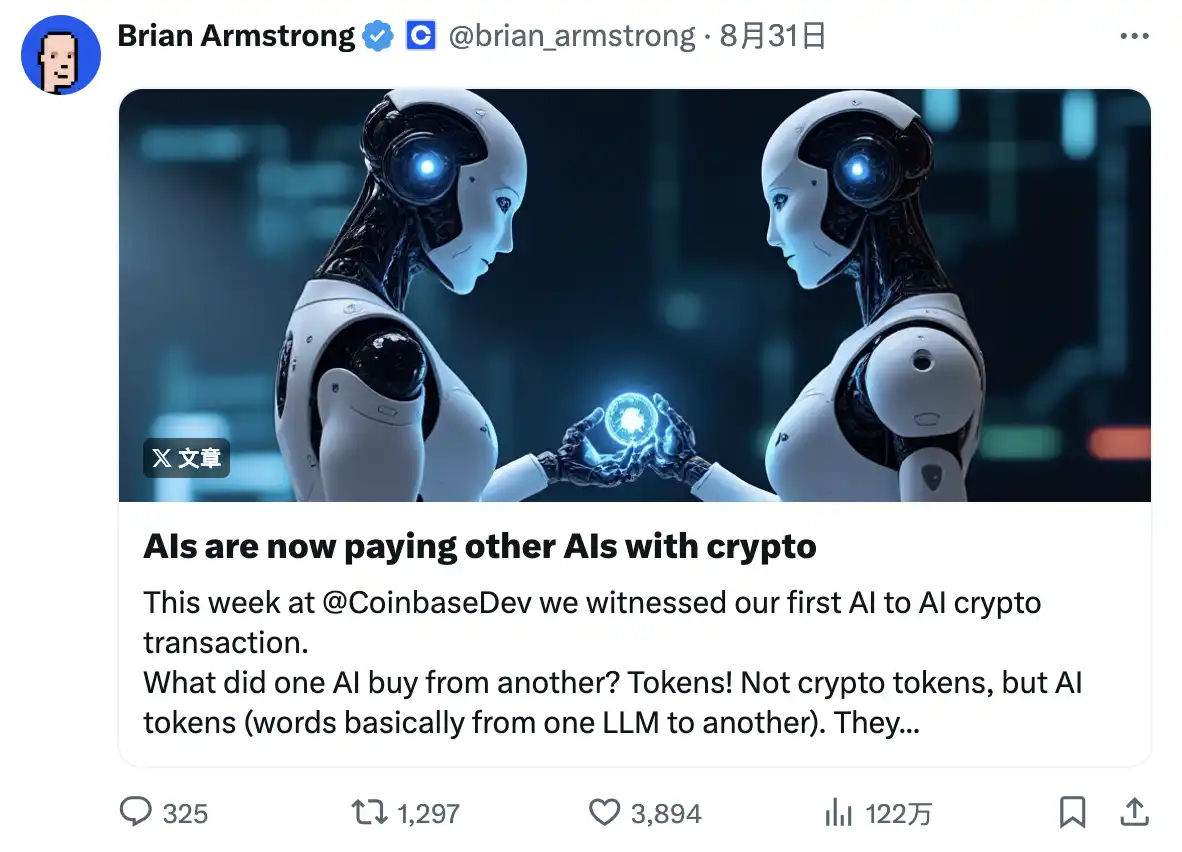 仿佛是对他这句话的回应,Coinbase CEO Brian Armstrong 上周六宣布在 Base 网络上实现了首笔 AI 对 AI 的加密交易,一个 AI 使用加密货币(tokens)购买了另一个 AI 生成的文本内容(tokens)。