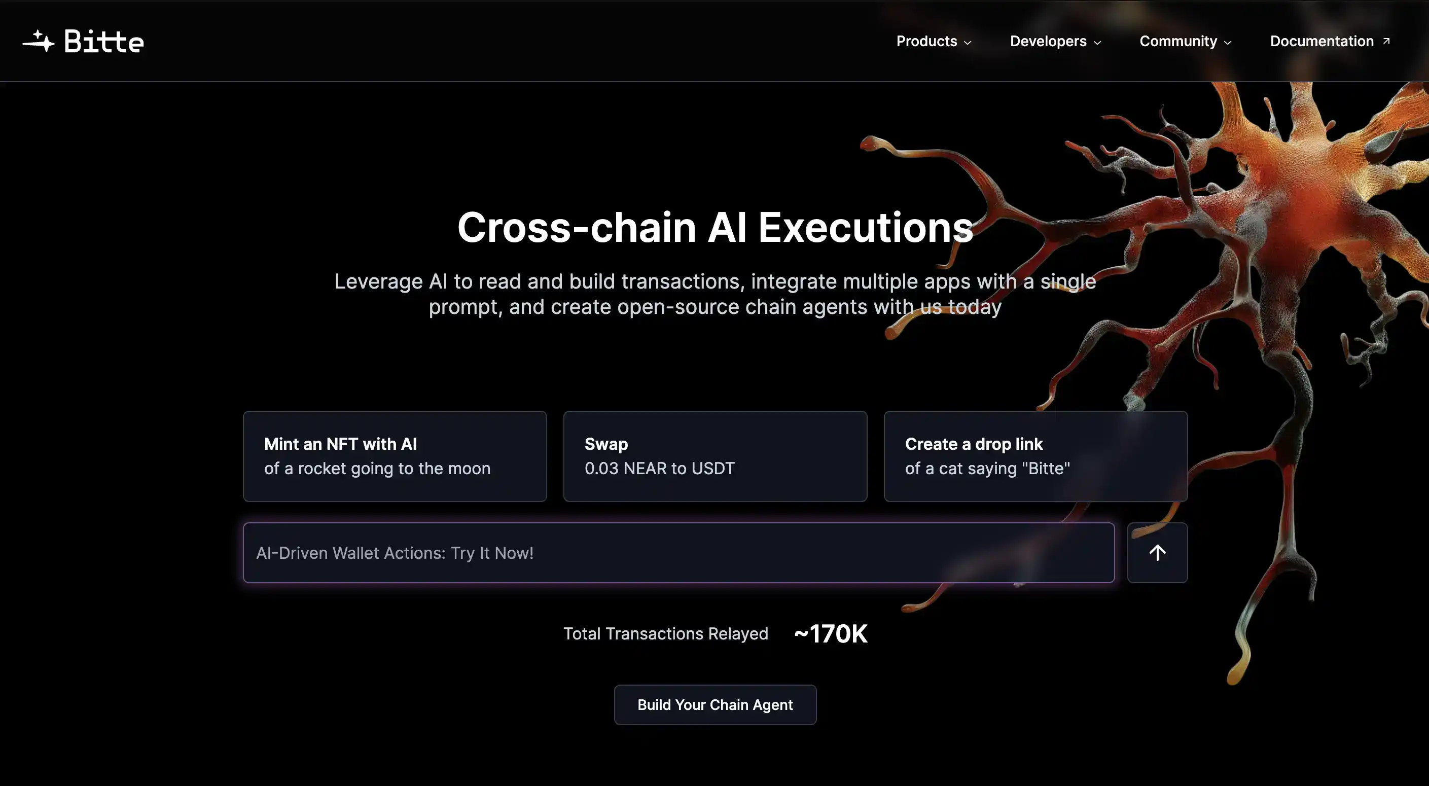 比如,用户输入「Mint an NFT with AI of a rocket going to the moon」,Bitte 就会调用 DALL-E 3 的 API 生成一张火箭登月的图像并在 NEAR 区块链上进行铸造。除此之外,用户还可以让 Agent 替自己完成 Swap 和转移代币、创建合约和 NFT 集和等等一系列简单的操作。