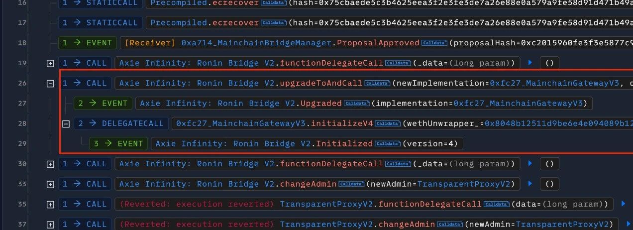 1) Ronin 团队错误升级 Axie Infinity: Ronin Bridge V2 合约,对其合约的实现由 MainchainGatewayV3(旧)升级为 MainchainGatewayV3(新),并调用 MainchainGatewayV3(新)的 initializeV4 方法初始化;