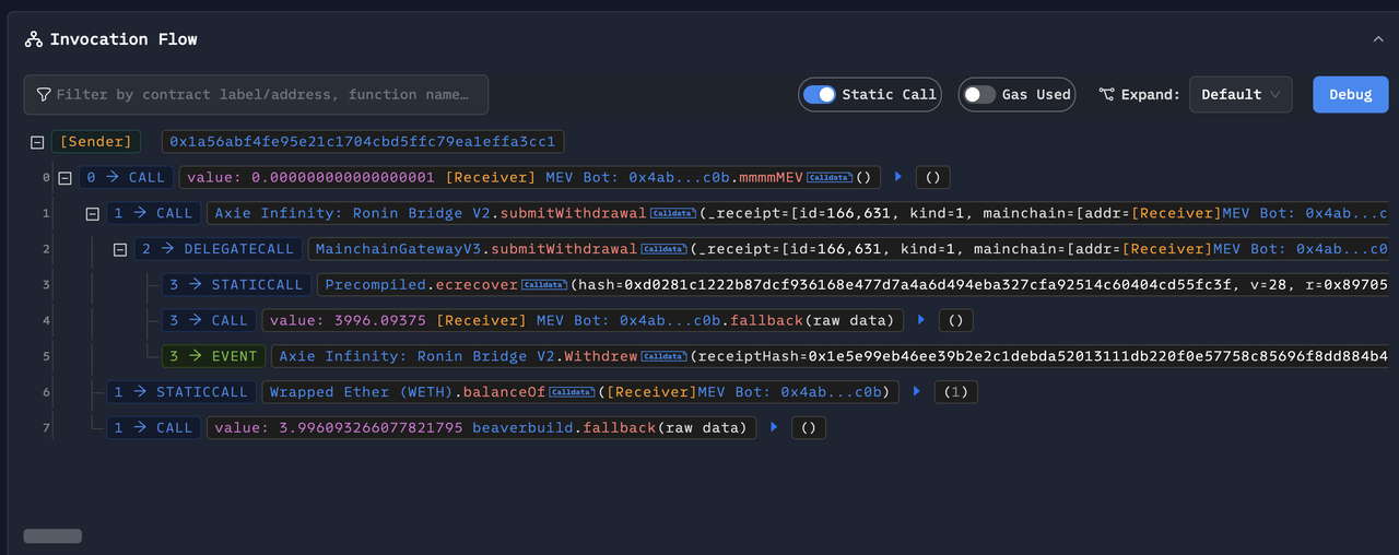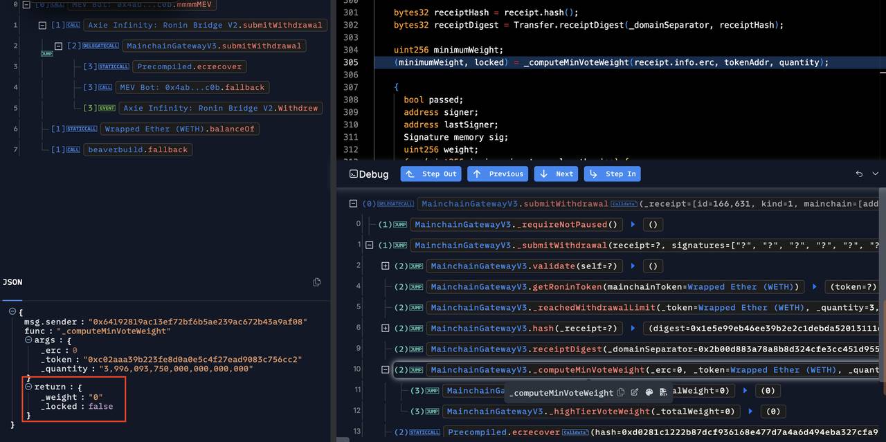 2)攻击者发现 MainchainGatewayV3(新)的 _totalOperatorWeight 未初始化,当前为 0,则可以绕过提取资金时的签名验证。攻击者传入任意的签名数据直接提取了 3,996.09375 ETH;
