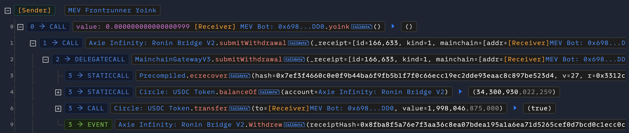3)在第二笔攻击交易中,攻击者传入任意签名,直接提取了 1,998,046 USDC;