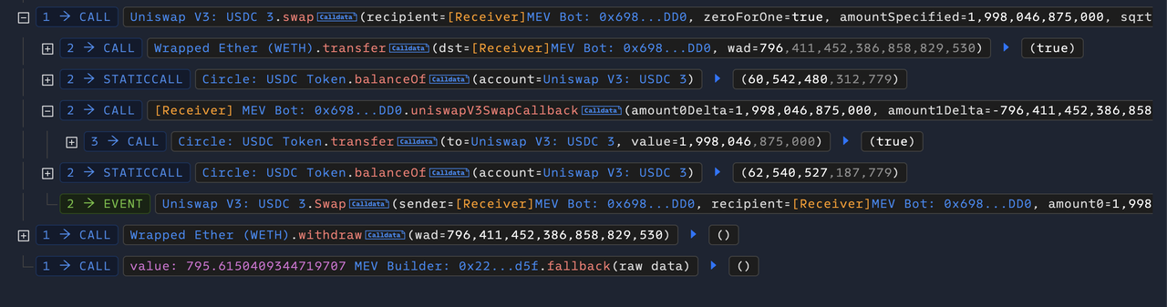 4)攻击者通过 Uniswap 将 1,998,046 USDC兑换成 796 WETH。