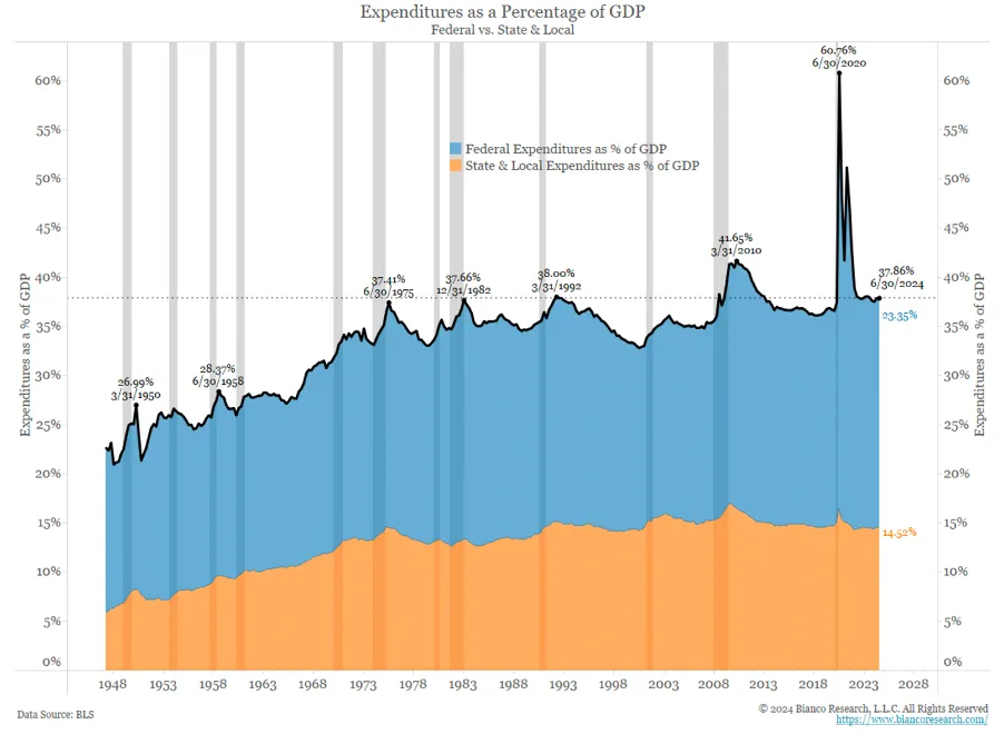 在和平时期,总体政府支出达到了历史最高水平。当然,这里的“和平”是相对的,仅指帝国公民的感受;对于那些因美国武器而丧命的人来说,近几年几乎称不上和平。