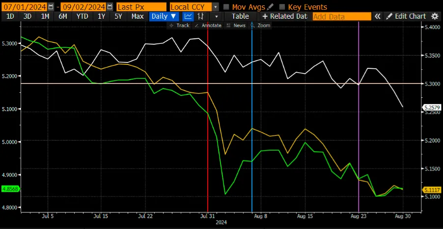 接着,我考虑到货币市场基金(MMF)是否因为国库券收益率下降,而选择卖出国库券并将现金存入 RRP,以追求更高的短期美元收益。我绘制了一张图表,展示了 1 个月(白色)、3 个月(黄色)和 6 个月(绿色)国库券的收益率。图中的垂直线标记了几个关键日期:红线代表日本央行加息的日子,蓝线代表日本央行在市场反应不佳时宣布不会考虑未来加息的日子,紫线则是杰克逊霍尔会议演讲的日子。