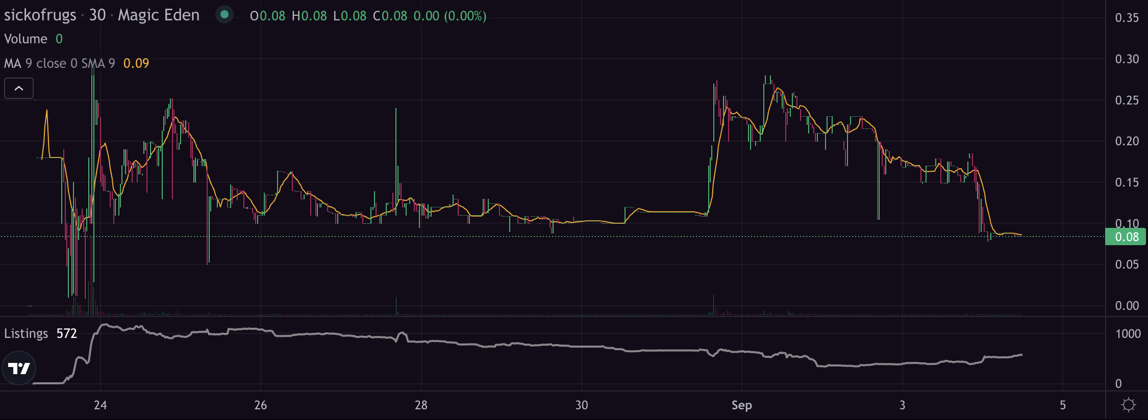 前两日,Sick on SOL 在 meme 社区中的关注度快速上升,其 NFT 在 8 月 23 日以 blinks 的形式完成 mint,地板价在 9 月 1 日上涨了三倍。原本定于 9 月 3 日晚 11 时上线的代币 SICK 成为了 meme 玩家的关注焦点。