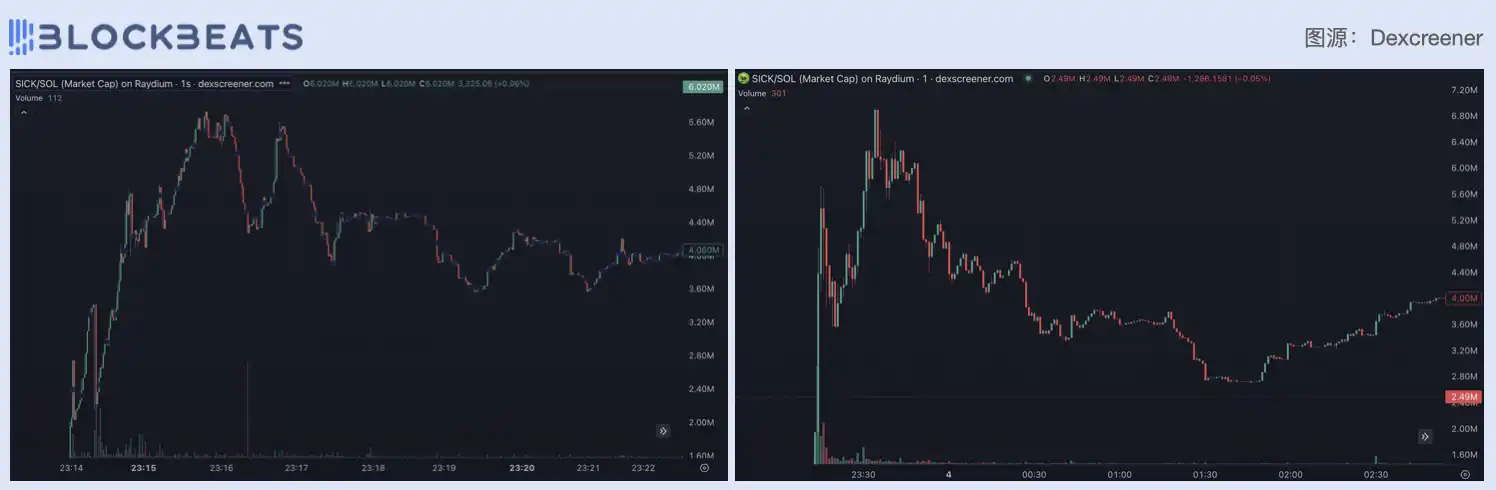 昨夜, 小编也蹲守了 SICK 的开盘时刻。SICK 宣布的上线时间为 23 时,但根据 Dexcreener 和 GMGN 看,合约真正发射时间为 23 时 13 分 59 秒,Dexcreener 数据显示,开盘两分钟后 SICK 的市值就冲到了 550 万美元左右。之后,SICK 在 4 分钟里急速下跌 37%,然后转而持续上涨 13 分钟,币价翻倍。此时距开盘仅过去了 20 分钟。