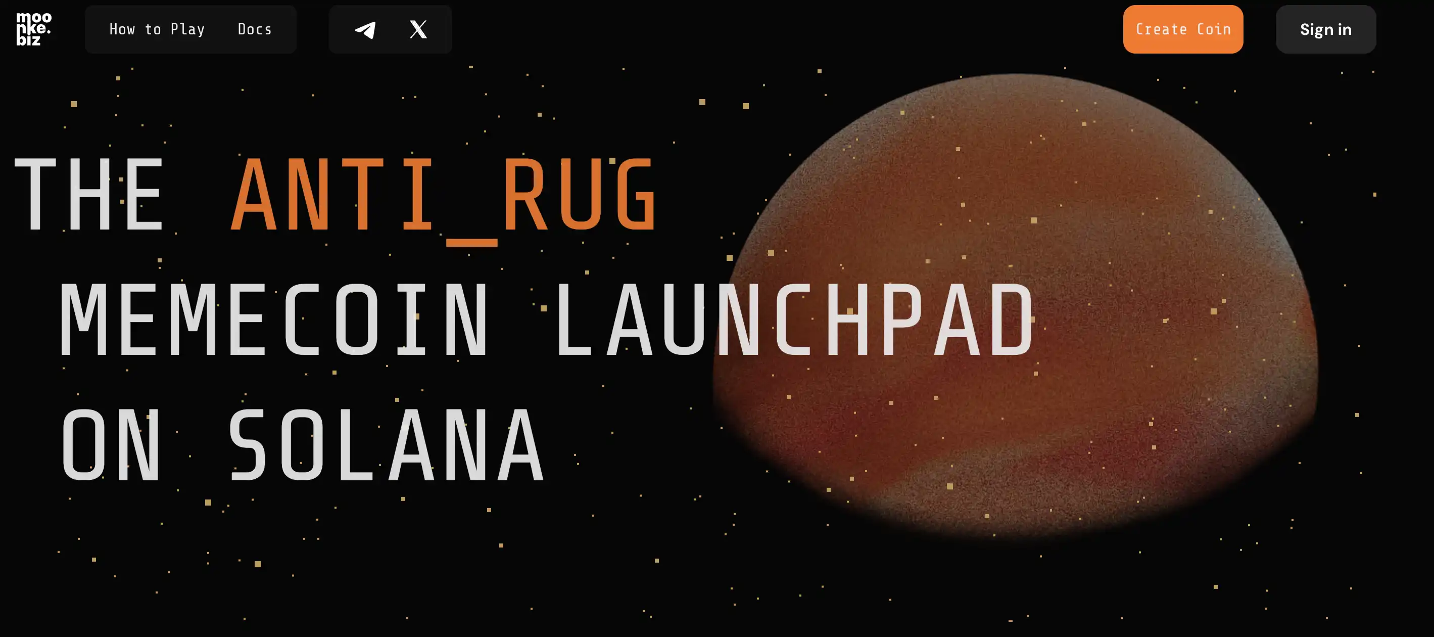 在Moonkebiz的官推中,介绍其使命为革新Pump.fun上泛滥的meme rug现象。进入 Moonkebiz 主页,首先看到其 slogan 为「Solana 上没有 rug 的 meme 发射平台」。