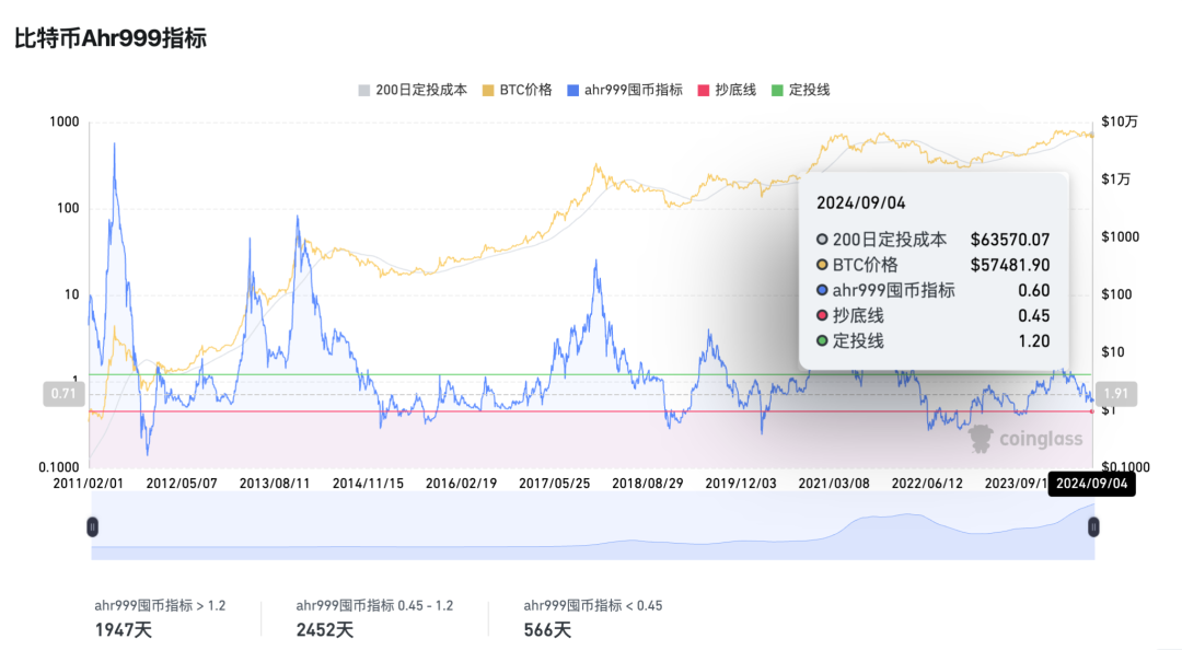 ahr999 指标=(比特币价格 /200 日定投成本)*(比特币价格 / 指数增长估值)