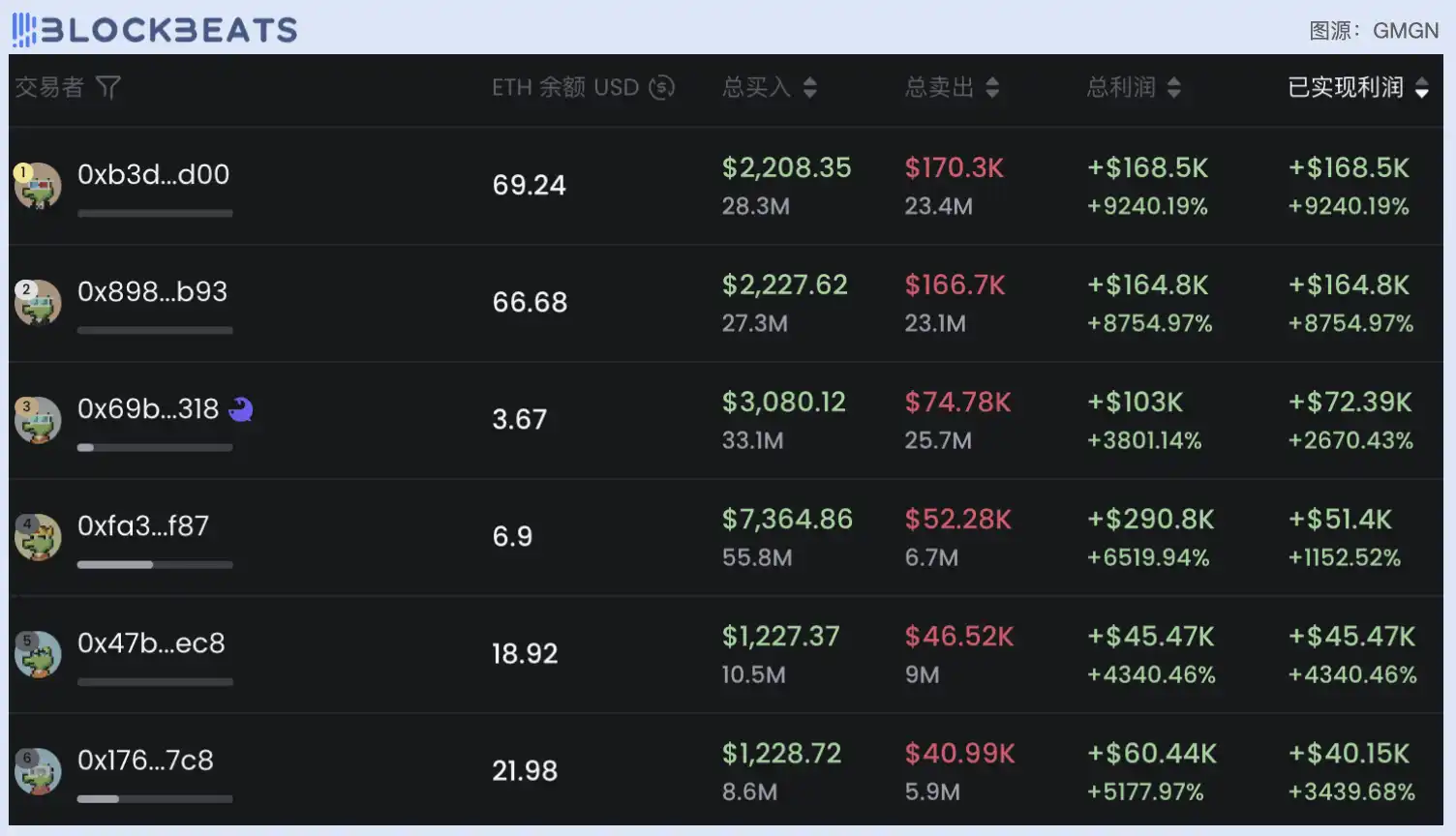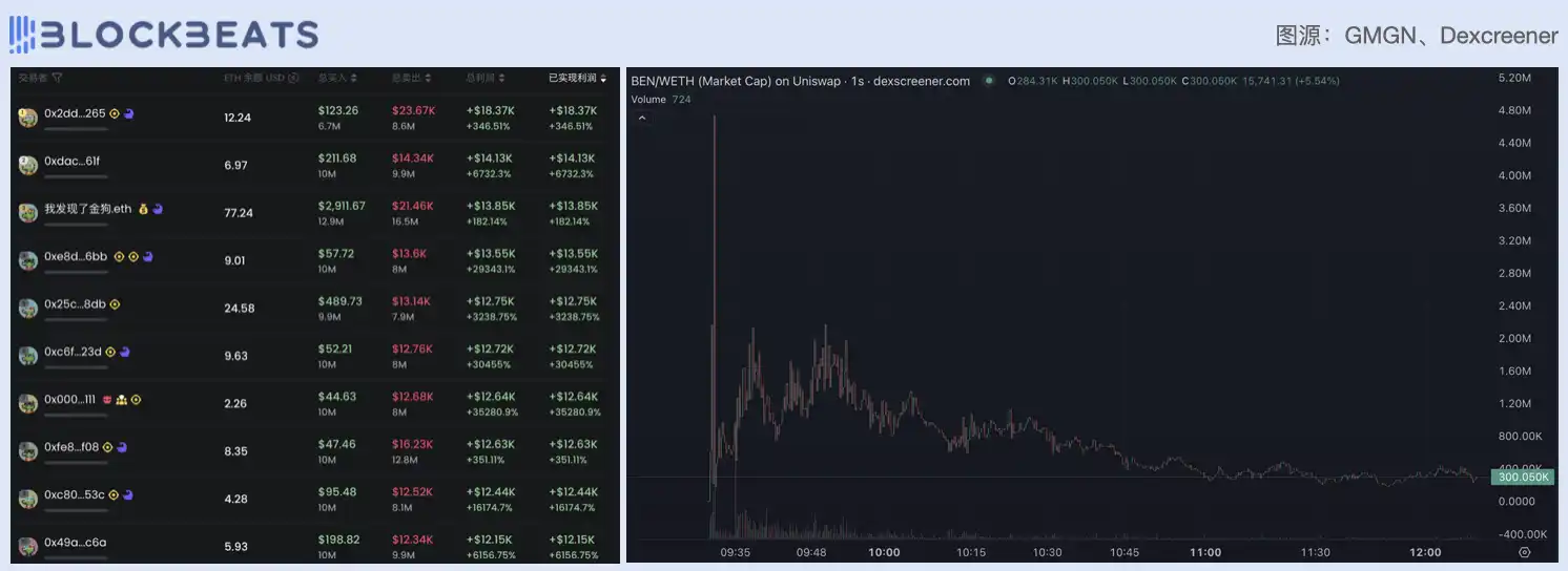 除了 FARM,手续费收入 14 万美元、被 TaxFarm.ing 官推展示的 meme 币$BEN(Farmer Ben)也让许多人体验到了百倍币的快乐。在 gmgn 显示的前排盈利交易者中,获利最多的前十个交易者中,九个交易者的买入成本低于 500 美元,四个交易者以 50 美元左右的成本获得了 1 万美元的收益。
