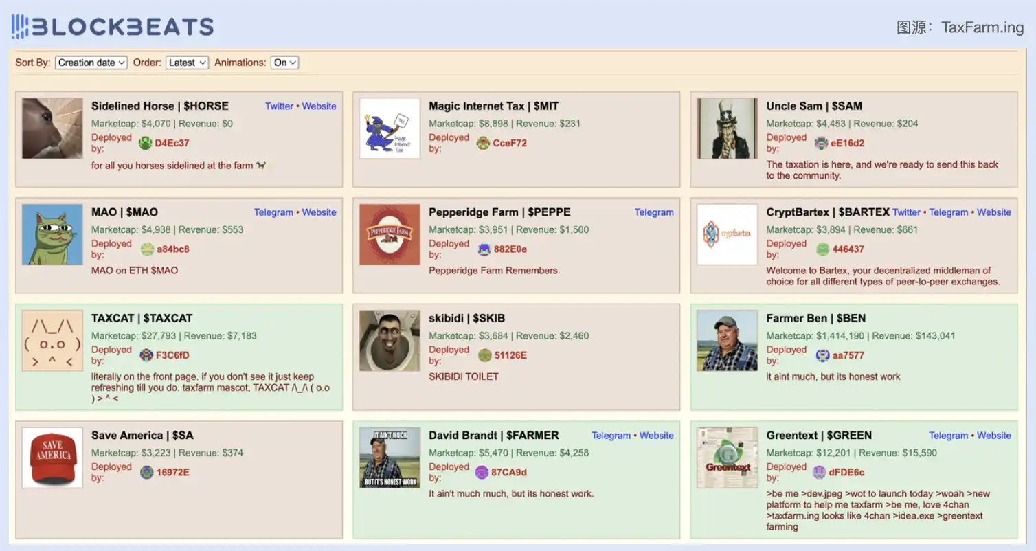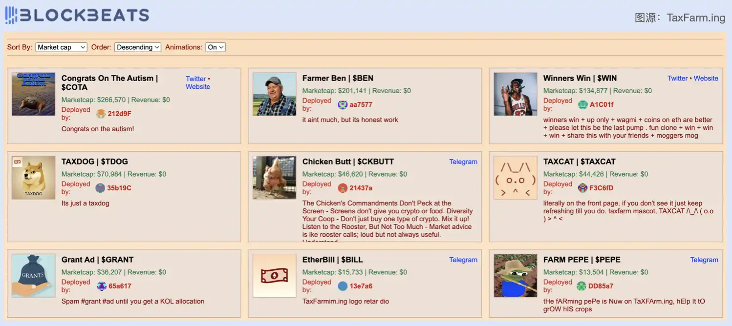 根据 TaxFarm.ing 的介绍,协议收入主要来自平台上的 meme 币交易费用的 10%。在 Blockbeats 于上午 10 时左右的截图中显示,TaxFarm.ing 上一个名为$BEN(Farmer Ben)的代币收入已经达 14 万美元.