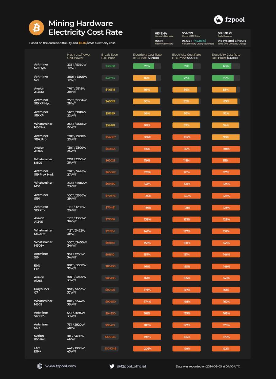 电费以 $0.07/ 度、币价 56000 计算,当前主流 25 款矿机,只有较高阶的 7 款营利,其他 18 款矿机皆跌破成本价,要注意的是,该图表并未加上前文提及的其他费用。若简单粗估其他费用只占电费的 10%,那么市面三仅剩 3 款矿机处于营利状态。