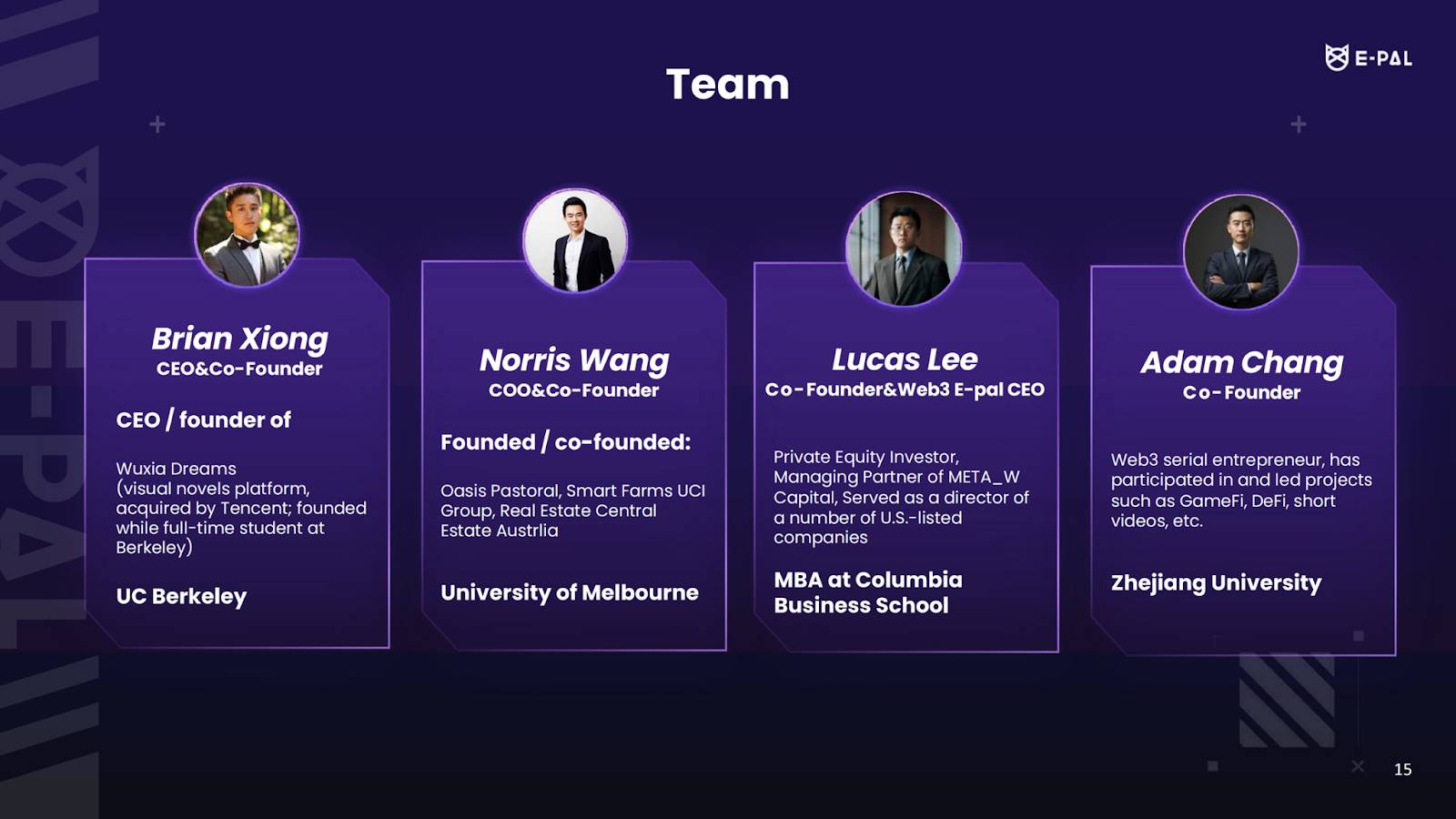 根据官方资料,E-PAL 的四名共同创始人都具备深厚的 Web2 或 Web3 创业经验。CEO 曾创立了视觉小说平台「武侠梦」,并在被腾讯收购后继续发挥其创业才能。COO 则是 Oasis Pastoral 的联合创始人之一。其他两位共同创始人则在美国上市公司的资本管理、运作以及 DeFi 和 GameFi 等 Web3 领域积累了丰富的经验。这个团队不仅在传统互联网领域打下了坚实的基础,更在 Web3 的前沿阵地上有所作为。