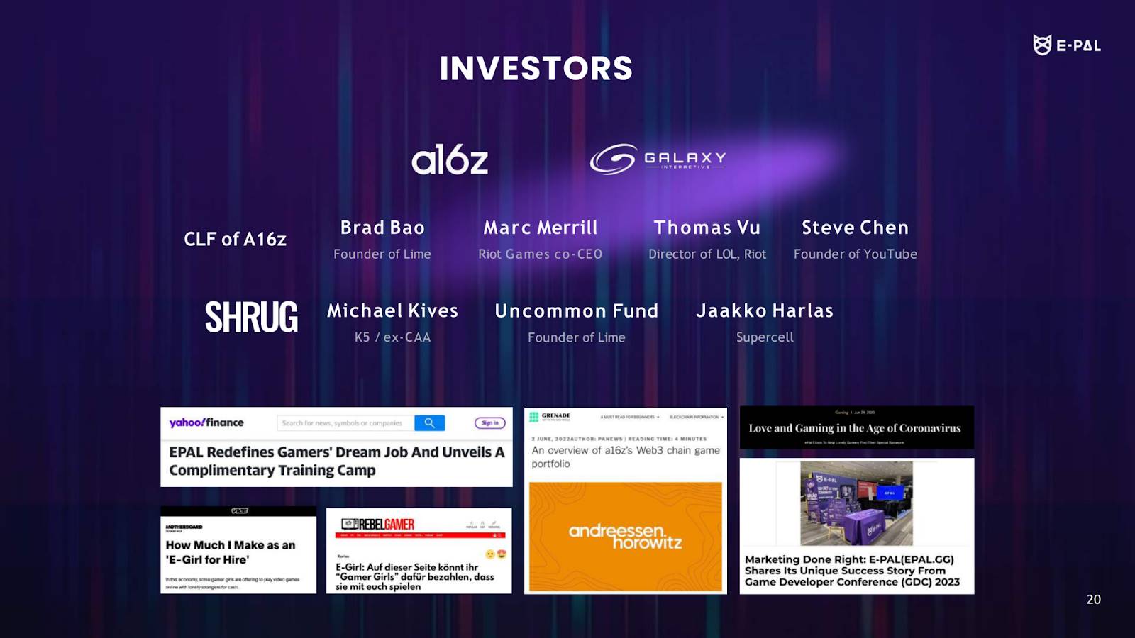 这个团队的根扎在美国洛杉矶,前身是北美最大陪玩平台 Epal,手握 a16z、Galaxy 这些顶级风投的支持,甚至连 YouTube 联合创始人 Steve Chen 和 Riot Games 的 CEO Marc Merrill 都押了注。曾几何时,「Epal」成了陪玩的代名词,420 万活跃用户,45 万 Epals,做的风生水起。