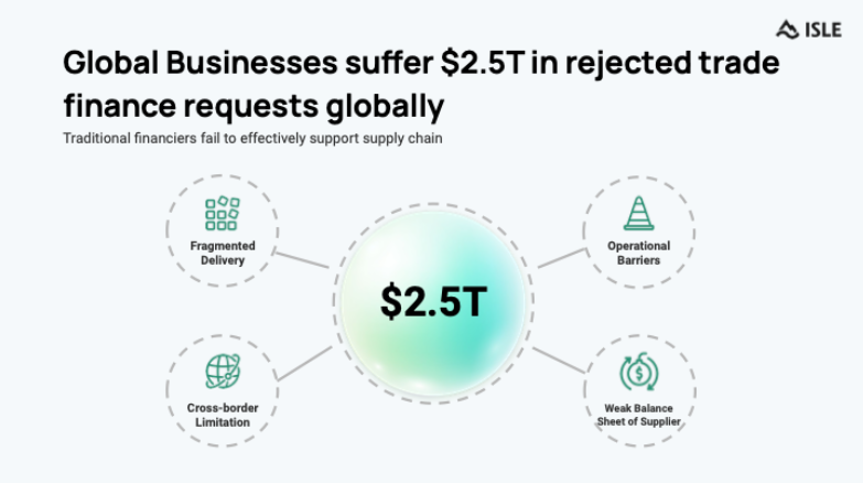 全球企业因传统金融机构的局限性而導致每年 $2.5 万亿的贸易融资需求被拒绝(from: Isle Finance)