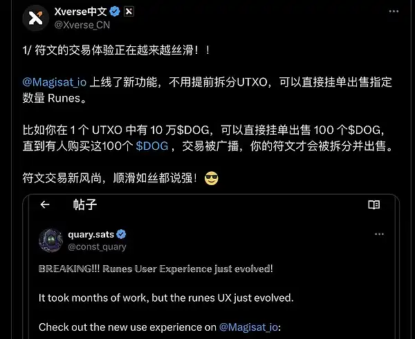 ● 符文的交易体验正在越来越丝滑。@Magisat_io 上线了新功能,不用提前拆分 UTXO,可以直接挂单出售指定数量 Runes。by @Xverse_CN