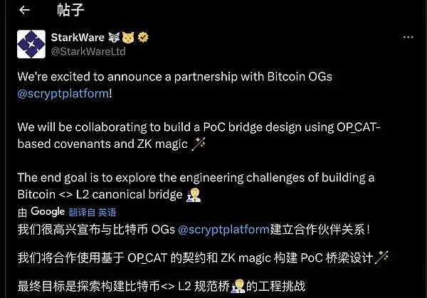 ● @StarkWareLtd 宣布与比特币 OGs @scryptplatform 建立合作伙伴关系。将合作使用基于 OP_CAT 的契约和 ZK magic 构建 PoC 桥梁设计。最终目标是探索构建比特币 L2 规范桥的工程挑战。