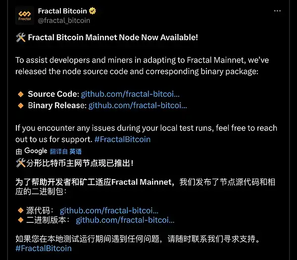 ● @fractal_bitcoin 分形比特币主网节点现已推出!为了帮助开发者和矿工适应 Fractal Mainnet,发布了节点源代码和相应的二进制包。