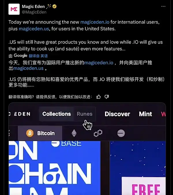 ● ME @MagicEden 宣布为国际用户推出新的 magiceden/io 并向美国用户推出 magiceden/us