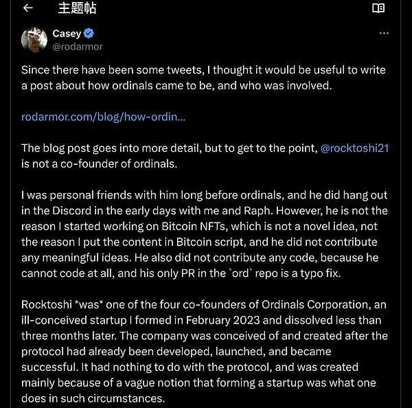 ● Casey 称 Rocktoshi 不是 Ordinals 联创 长文介绍 Ordinals 起源