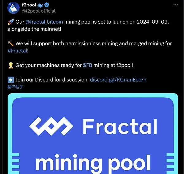 ● 鱼池 f2pool @f2pool_official 宣布,其 @fractal_bitcoin 采矿池将于 2024-09-09 与主网一起启动。将支持 #Fractal 无需许可的挖矿和合并挖矿。