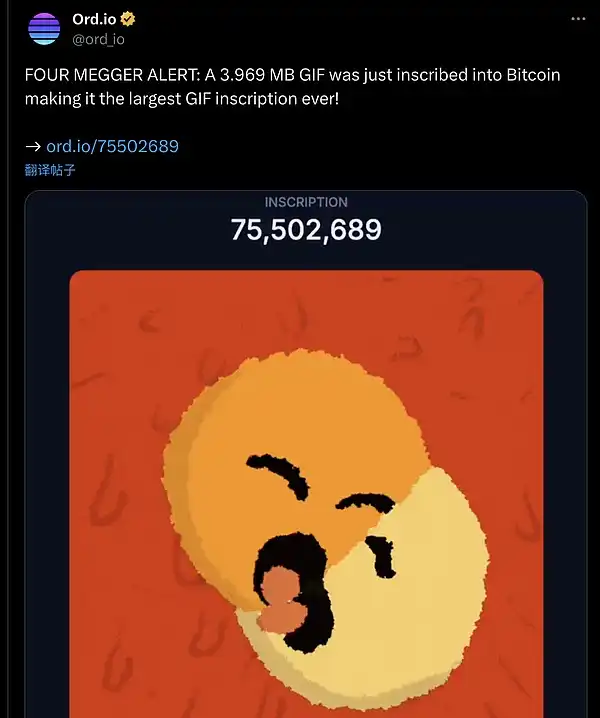 ● 一个 3.969 MB 的 GIF 刚刚被刻入比特币,成为有史以来最大的 GIF 铭文。