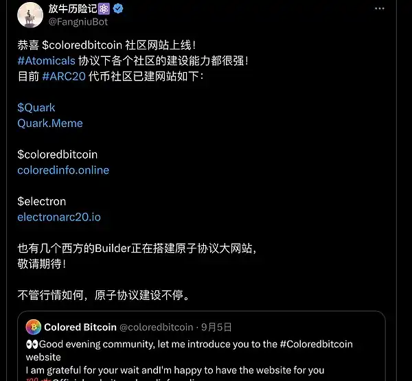 ● Atomicals 协议下各个社区的建设能力都很强!目前 #ARC20 代币社区已建网站如下 http://Quark.Meme 、http://coloredinfo.online 、 http://electronarc20.io 也有几个西方的 Builder 正在搭建原子协议大网站。by @FangniuBot