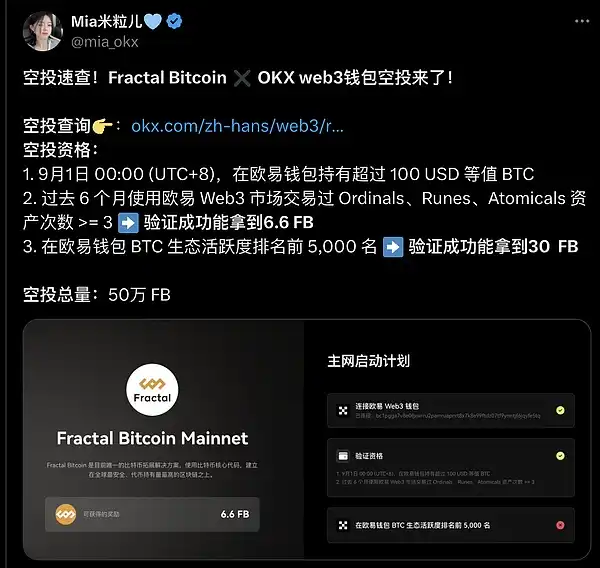 ● Fractal 联手 OKX @OKXWeb3_CN @okxchinese,主网启动计划,符合资格的可以获得 OKX 提供的 6.6 FB 空投奖励。