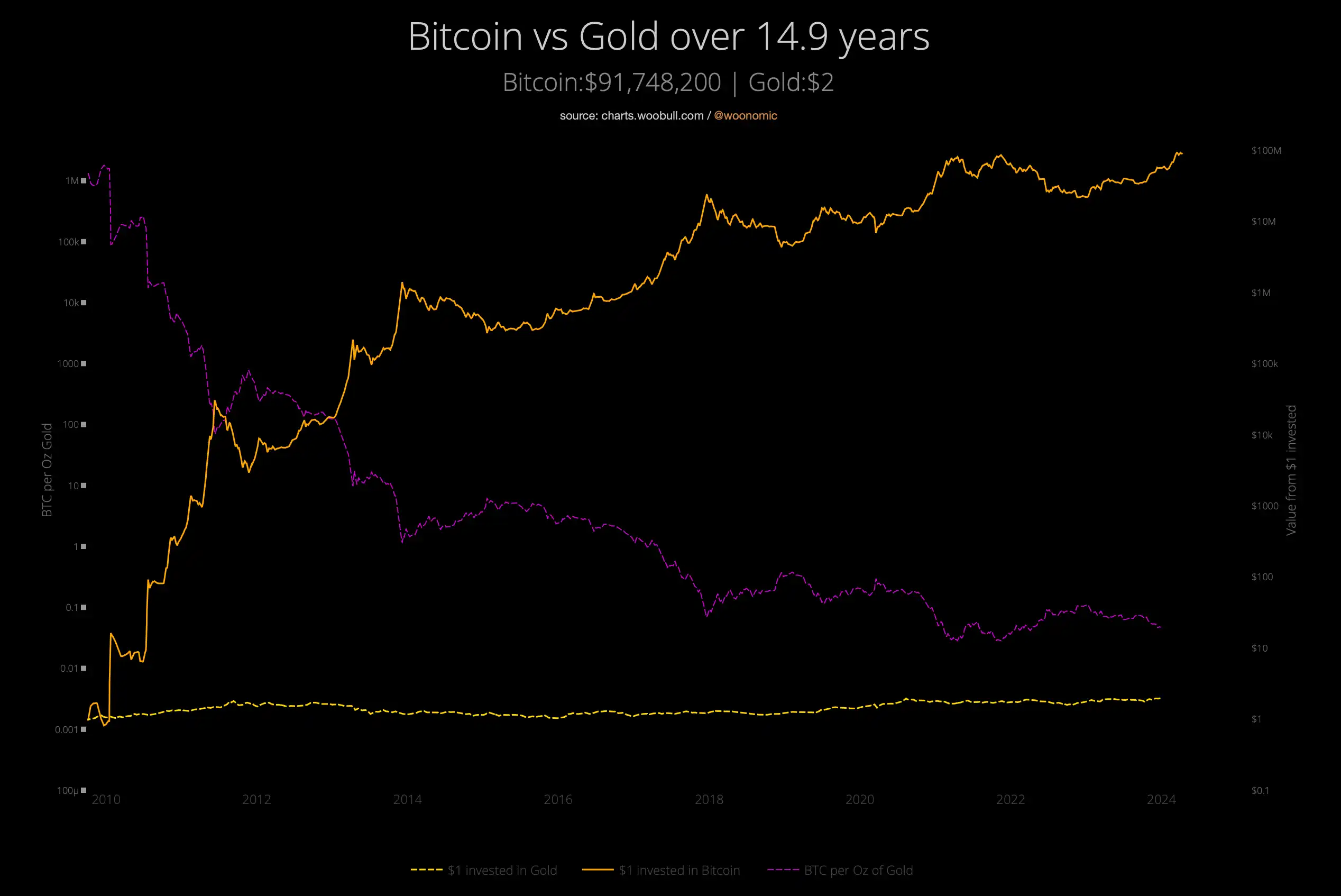 过去近 15 年黄金对比特币的价格表现,图源:Woobull