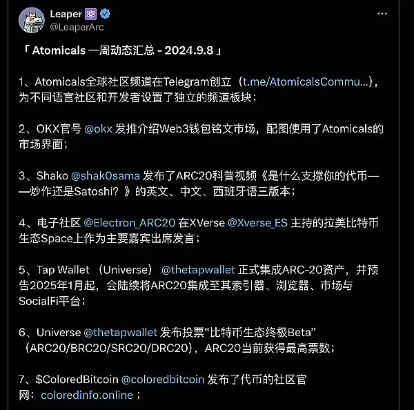 ● Atomicals 一周动态汇总。@okx 配图使用了 Atomicals 的市场界面,OKX 宣布 Fractal 空投资格包含 Atomicals 资产,染色币网站上线等。