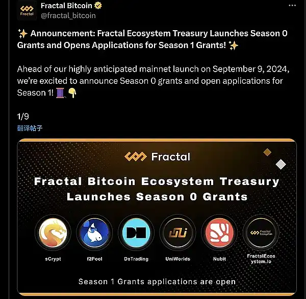 ● Fractal @fractal_bitcoin 生态系统金库启动第 0 季 Grant 并开放第 1 季赠款申请!向已经在 Fractal 上取得重大进展的六支杰出开发团队颁发 60,000 FB。