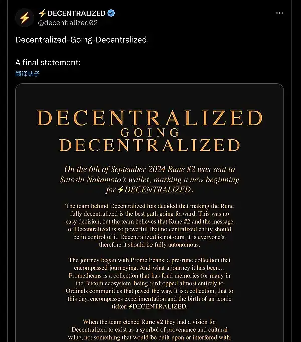 ● Decentralized @decentralized02 团队选择放弃了控制权,将 2 号符文发送到了中本聪钱包。从普罗米修斯到 2 号符文,团队投入百万,铸就比特币文化符号。团队相信比特币和符文的未来,魔力无限。