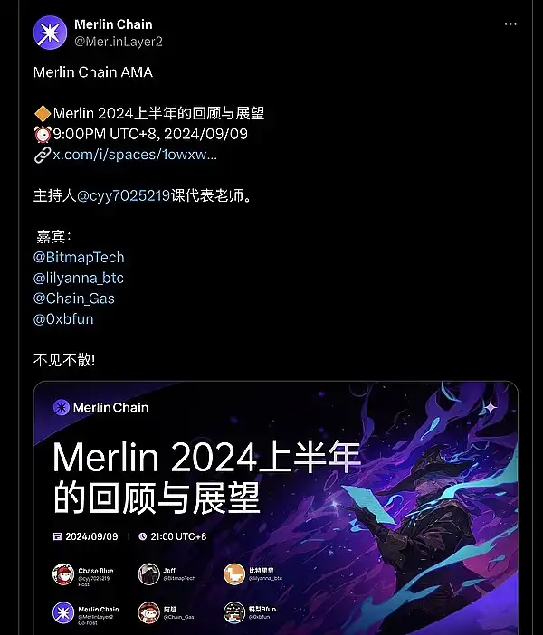 ● 9 号 Merlin 将开一场题为「Merlin 2024 上半年的回顾与展望」的 Space。