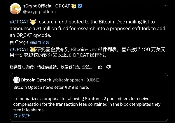 ● #OPCAT 研究基金发布到 Bitcoin-Dev 邮件列表,宣布拨出 100 万美元用于研究拟议的软分叉以添加 OP_CAT 操作码。
