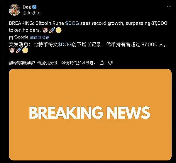 ● 比特币符文$DOG 创下增长记录,代币持有者超过 87,000 人。