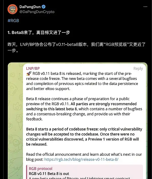 ● RGB 接近上线。LNP/BP 协会公布了 v0.11-beta8 版本,离「RGB 预览版」又更近了一步。