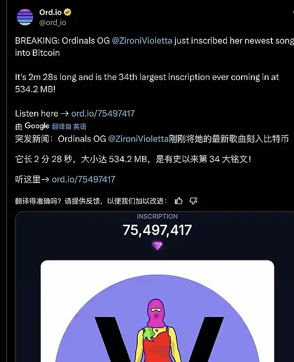 ● Ordinals OG @ZironiVioletta 刚刚将她的最新歌曲铭刻入比特币。它长 2 分 28 秒,大小达 534.2 KB,是有史以来第 34 大铭文。