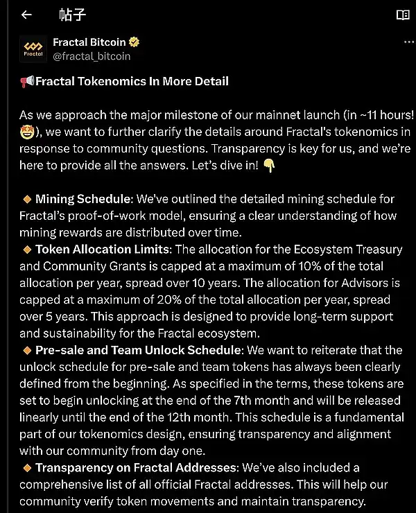 ● Fractal 即将迎来主网发布,并详细介绍其代币经济模型。经 GPT 测算 FB 初始流通量:约为 525 万到 1050 万 FB,主要来自挖矿和生态资金库。流通速率:在前 7 个月,流通量以每年 约 2100 万 FB 的挖矿速率增加。从第 7 个月开始,流通速率加快,预售和团队代币每月释放约 700 万 FB,使流通速率显著提升。